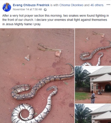 An Anambra-based clergyman, Evangelist Chibuzo Fredrick, has claimed two snakes started fighting after hot prayer session in his church.