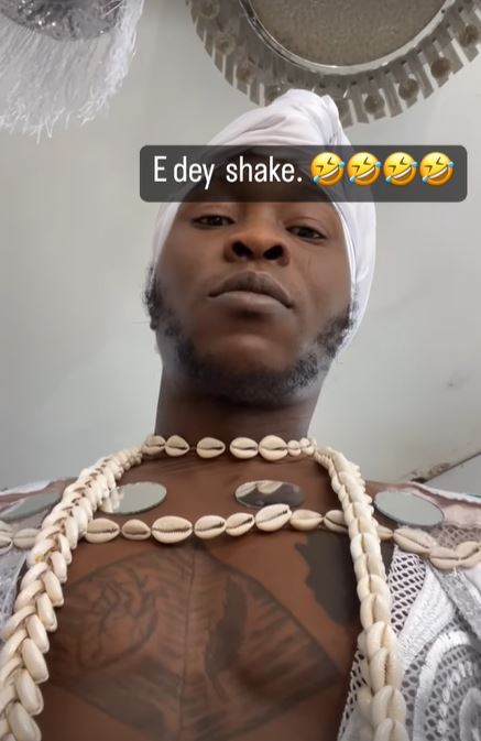 For the shoot, he wore a top that looks quite feminine and accessorised it with a head scarf and white cowry shell pearls.