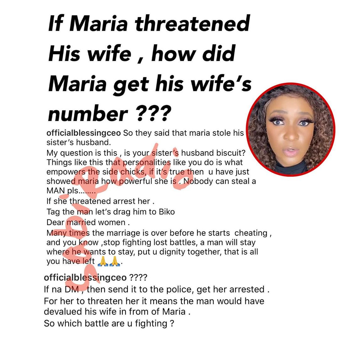 So they said that Maria stole his sister’s husband. My question is this, is your sister’s husband biscuit? Things like this that personalities like you do is what empowers the side chicks, if it’s true then u have just showed maria how powerful she is. Nobody can steal a MAN pls If she threatened arrest her. Tag the man let’s drag him to Biko.Dear married women. Many times the marriage is over before he starts cheating, and you know, stop fighting lost battles, a man will stay where he wants to stay, put u dignity together, that is all you have left???? If na DM, then send it to the police, get her arrested. For her to threaten her it means the man would have devalued his wife in front of Maria. So which battle are u fighting?” She wrote.