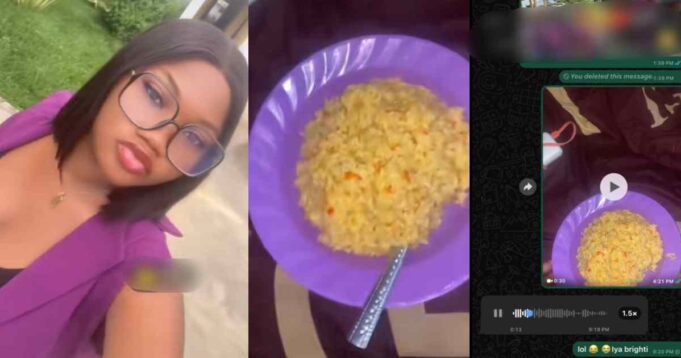 In the clip, the lady @oluwatemilorun shared their WhatsApp conversation, revealing the video of her rice dish, which strongly resembled village rice prepared with palm oil and lots of pepper to spice.