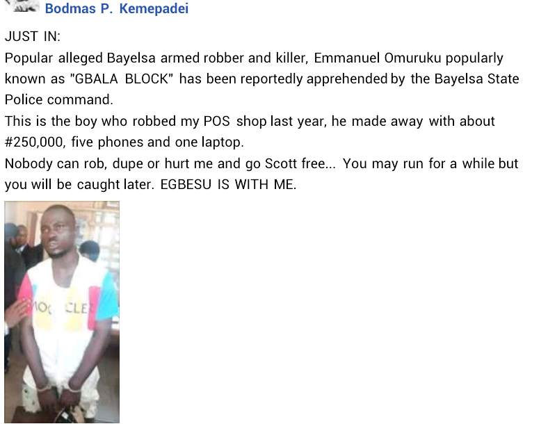 An Ijaw traditionalist, Bodmas Prince Kemepadei, recently took to Facebook to announce the arrest of a notorious criminal, Emmanuel Omuruku, a.k.a GBALA BLOCK by the Bayelsa State Police command.