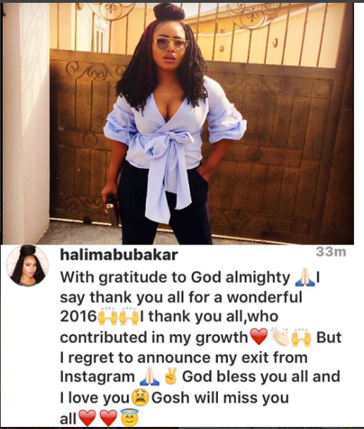 Nollywood actress, Halima Abubakar today exited the social media platform, Instagram.