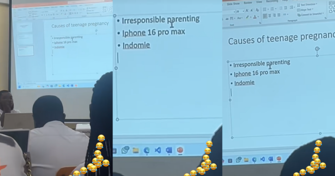 The causes of pregnancy displayed on the screen included irresponsible parenting, iPhone 16 Pro Max, and Indomie.