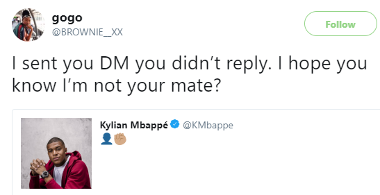 A Nigerian lady has taken to her Twitter account to out French footballer, Kylian Mbappe for not replying the Direct Messages she sent to him.