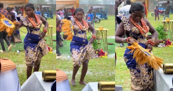She was captured in the video impeccably dressed in a beautifully crafted traditional attire, dancing energetically away in the rain with the guests cheering her on.