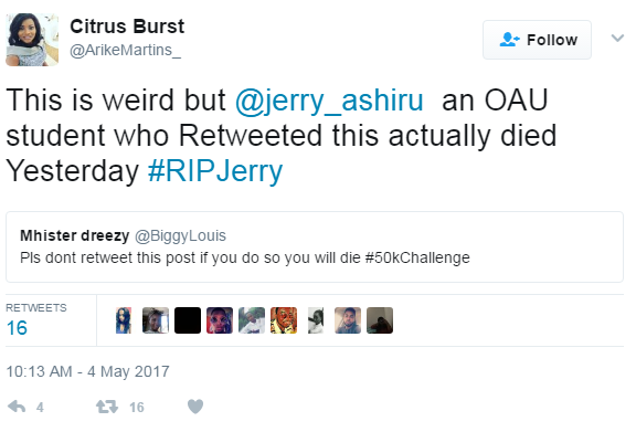 Then an OAU Student, Jerry Ashiru retweeted the tweet alongisde 15 other people………5 days later, he died.