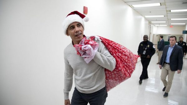 Trump’s predecessor made his rounds through the hospital to deliver gifts. He carried a sack of toys, including remote-control cars, Hot Wheels sets, nail polish, jigsaw puzzles and more.