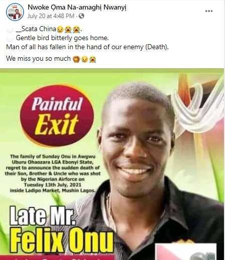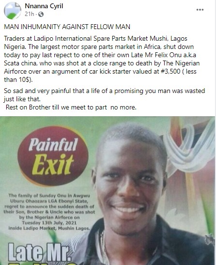 Late Felix Onu, aka Scata China met his untimely death while he went about his daily duty at the popular Ladipo market in Lagos state. It was gathered that he was carrying his goods into his shop during the fracas between traders and military men when a stray bullet hit him.