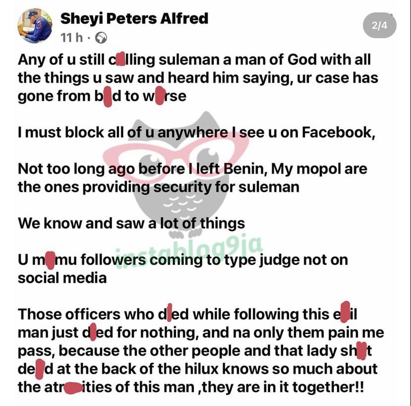 Police officer, Sheyi Peters has accused Apostle Suleman of being an evil kingpin responsible for the death of the officers that happened during his attack and demands that he be accountable.