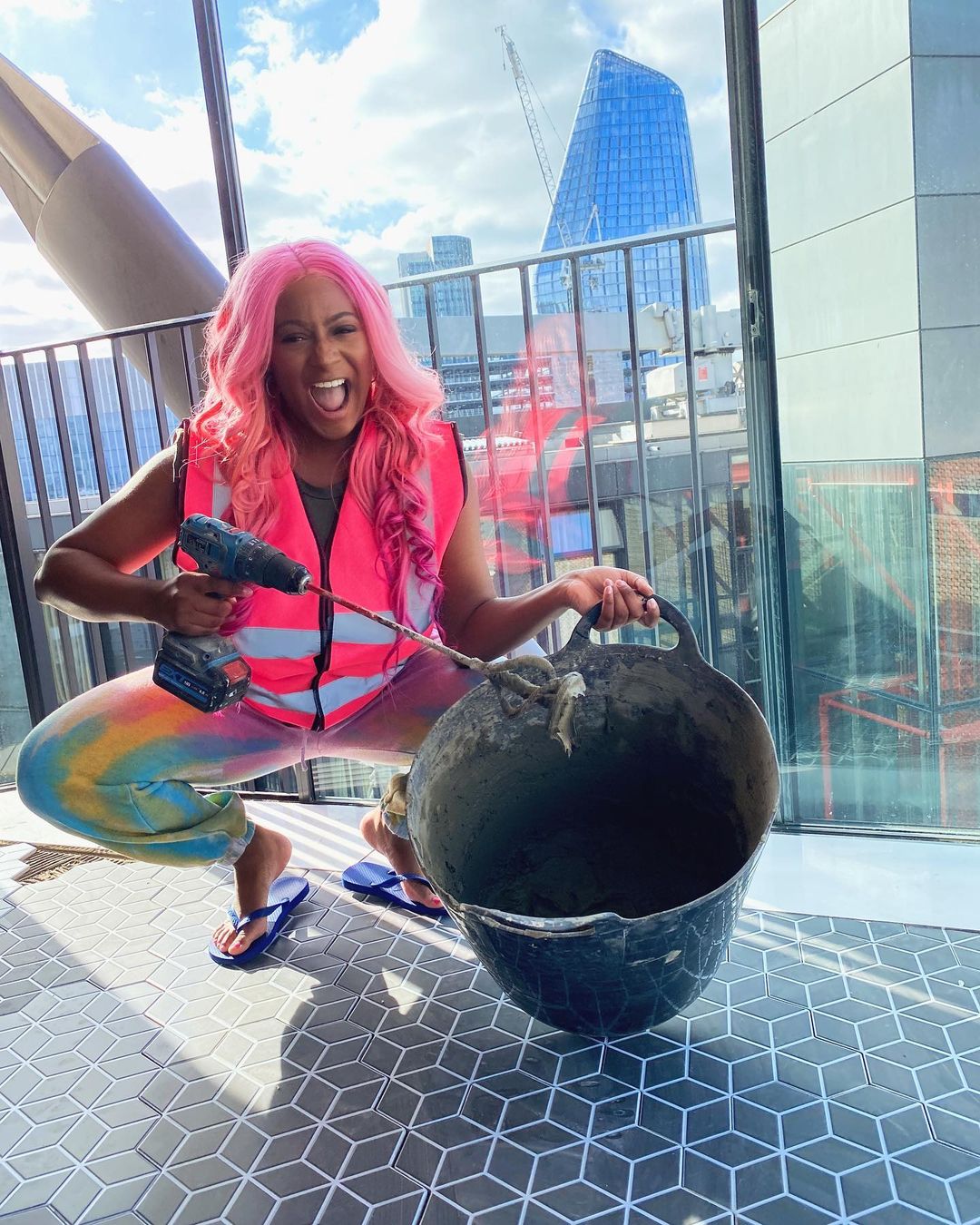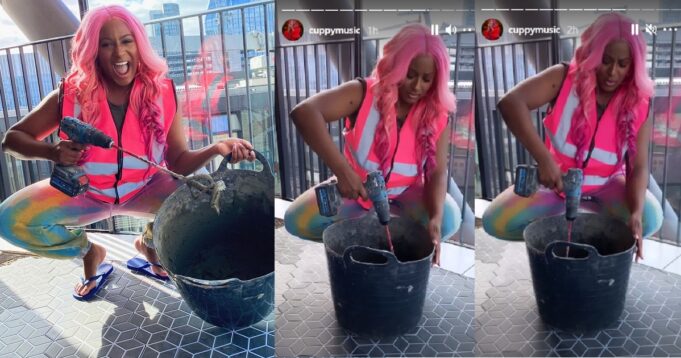 Cuppy shared a photo of herself mixing concrete in her new home and wrote,