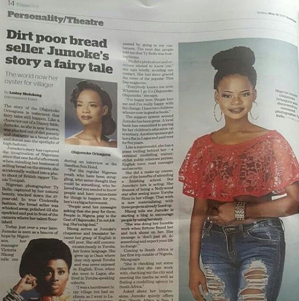 Fast rising Nigerian model, Olajumoke Orisaguna, whose rise to stardom story has been the inspiration of so many people, got featured on a South African newspaper, The Sowetan.