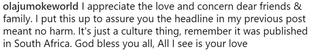 Olajumoke reacted to the ‘dirt poor’ description via her Instagram page after the outrage of her fans at the South African newspaper.