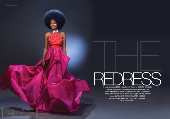 For the photo spread aptly titled, The Redress, Olajumoke was the perfect model for the chic, 60-inspired ‘not so typical’ award season gown which was completed with a thick afro.