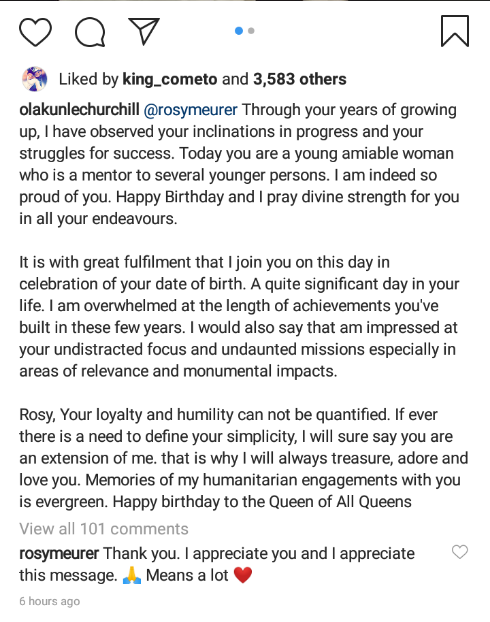 ‘@rosymeurer Through your years of growing up, I have observed your inclinations in progress and your struggles for success. Today you are a young amiable woman who is a mentor to several younger persons. I am indeed so proud of you. Happy Birthday and I pray divine strength for you in all your endeavours.