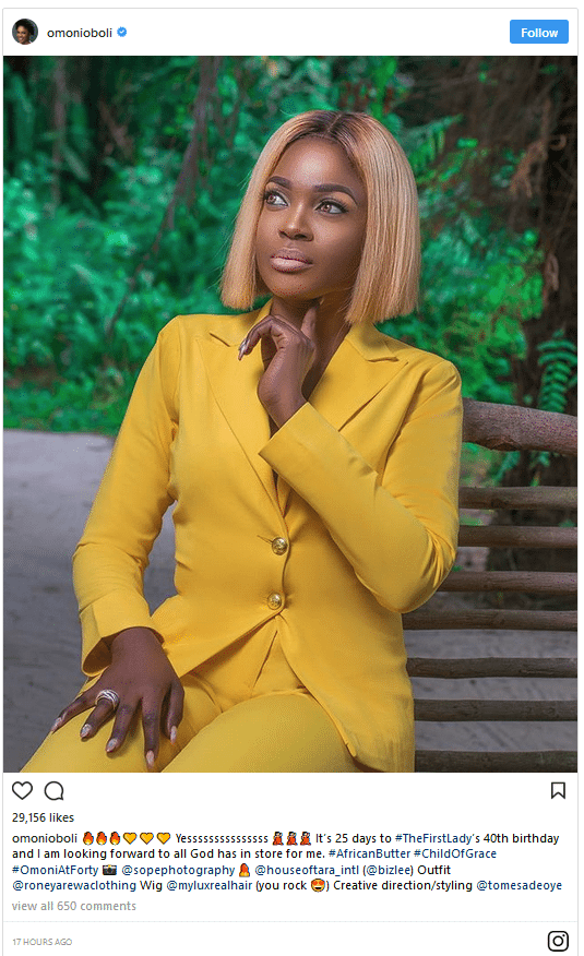 It’s 25 days to #TheFirstLady’s 40th birthday and I am looking forward to all God has in store for me. #AfricanButter #ChildOfGrace #OmoniAtForty ? @sopephotography ?@houseoftara_intl (@bizlee)