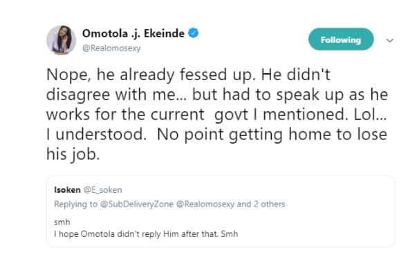However, Omotola this morning took to her twitter handle to react to the insinuation that her outburst was because politicians in the Buhari-led government do not give her free money.