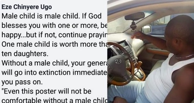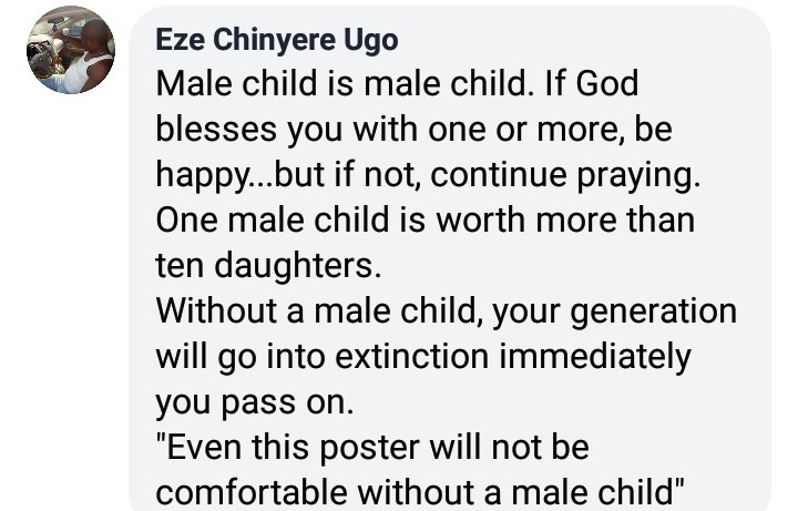 Male child is male child. If God blesses you with one or more, be happy…but if not, continue praying. One male child is worth more than ten daughters.Without a male child, your generation will go into extinction immediately you pass on.