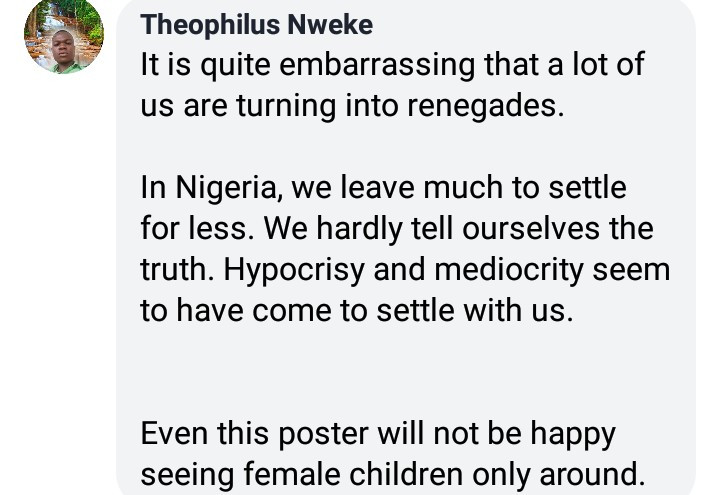 The poster used Barack Obama, Kobe Bryant, and Mark Zuckerberg as examples of men who are not obsessed with having sons to continue their legacy because they do not need an offspring to do that for them. The poster went on to advice men to stop putting pressure on their wives to birth male children because female children are equally important.