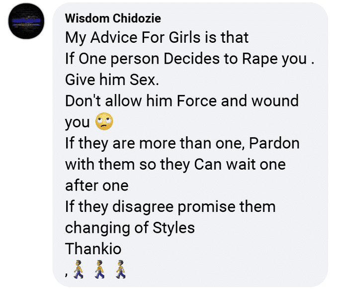 A Nigerian guy with the name, Wisdom Chidozie on Facebook has taken to his page to talk to ladies on the subject of rape.