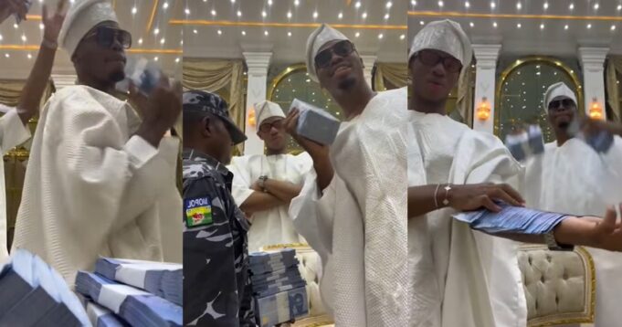 As the police officer held onto the bundles of cash, Siraheem and Wahab Okoya, the sons of Razaq and Shade Okoya, celebrated by spraying and showing off their family’s wealth and affluence.