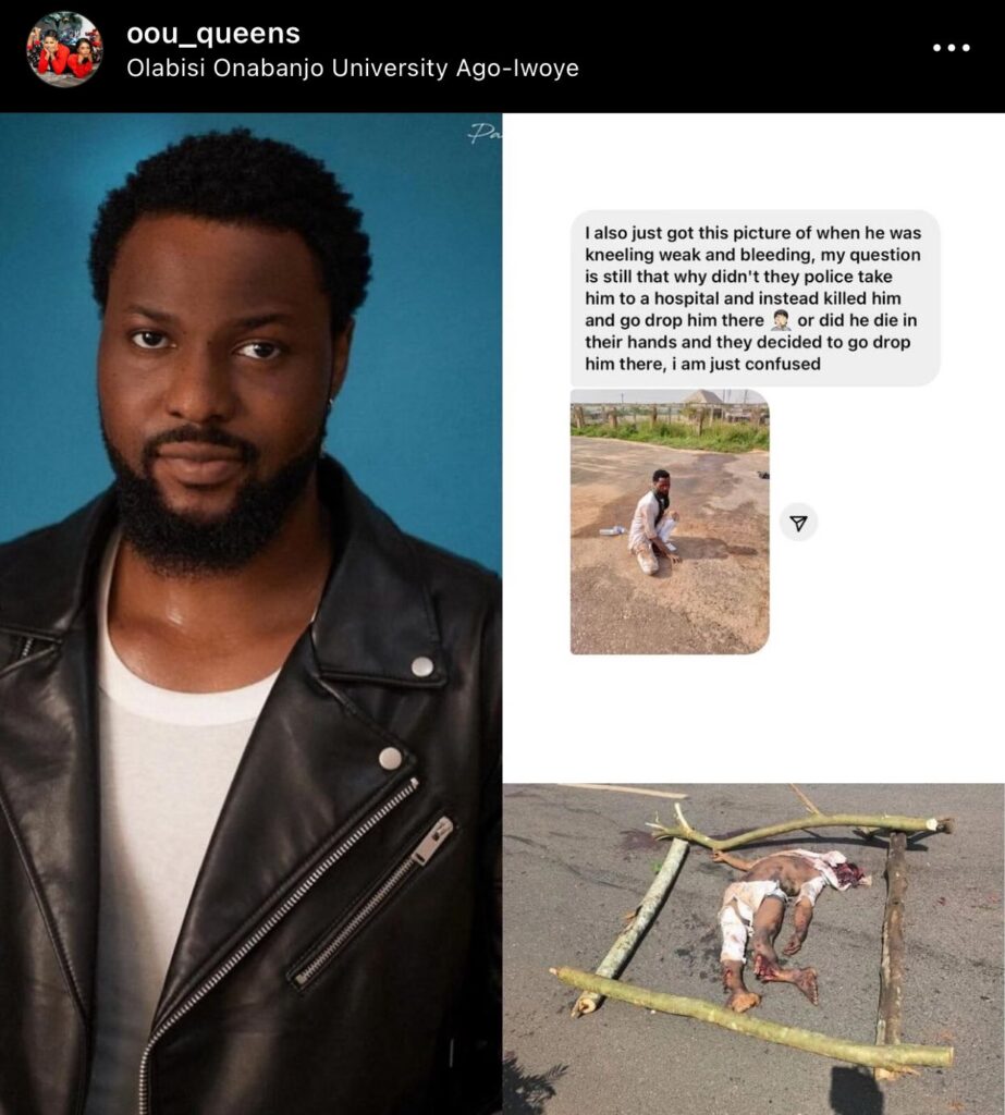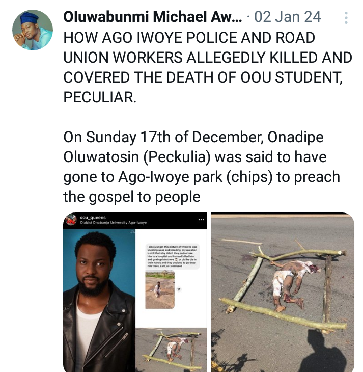 In a very distressing report, a student of the Olabisi Onabanjo University (OOU) Ago Iwoye, Onadipe Oluwatosin, aka Peckulia, has been reportedly killed by police officers and some road union workers who staged his death like a motor accident.