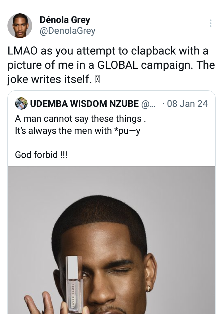 Not so surprisingly, a troll, who appears to fit into the caliber of men he was referring to, asserted that a real man would never make such statement, thus insinuating that Denola Grey is not a real man.