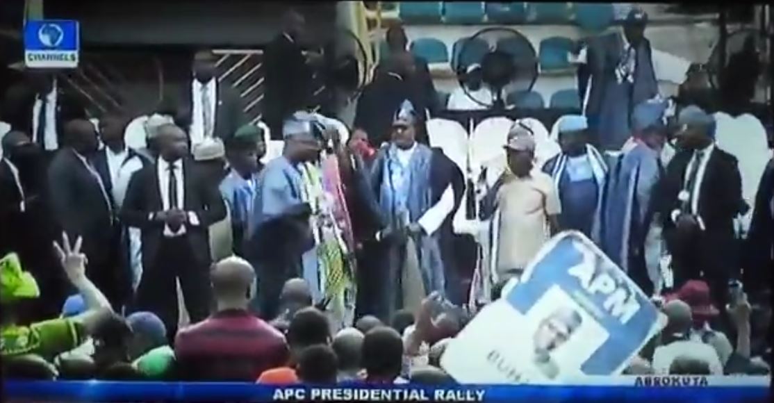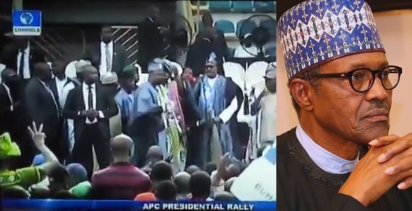 President Buhari was shielded by his security agents who blocked his front to avoid being hit by the objects being thrown at him and other party members.