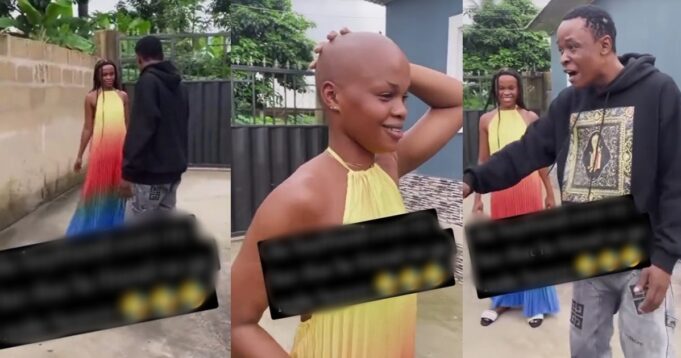 Nigerian man expresses rage after his girlfriend surprises him with a bald head despite giving her ₦15,000 to braid her hair.