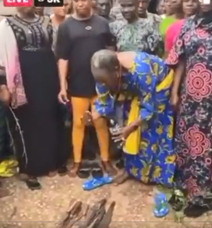 In a video shared online, metals are seen on the floor while a woman poured dry gin on it and invited the god of iron to fight for them.