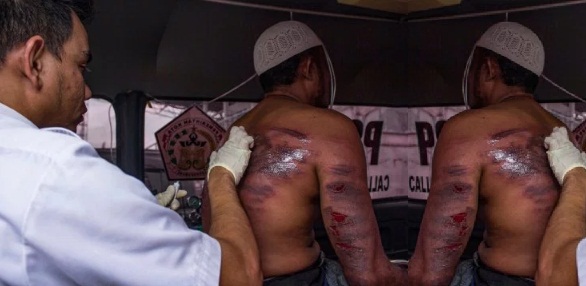 He raised his hand and begged the masked officer carrying out the lashing to stop, saying he could not take the pain, but after doctors declared him fit enough to continue, he received 95 more strikes.