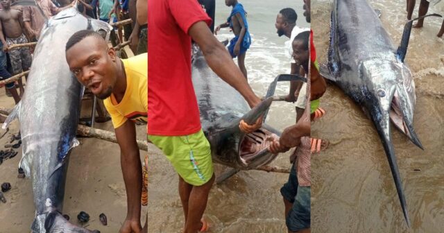 Photos making round on social media captured the moment a giant swordfish was caught at Oyorokotor fishing settlement in Andoni Local Government Area of Rivers State.