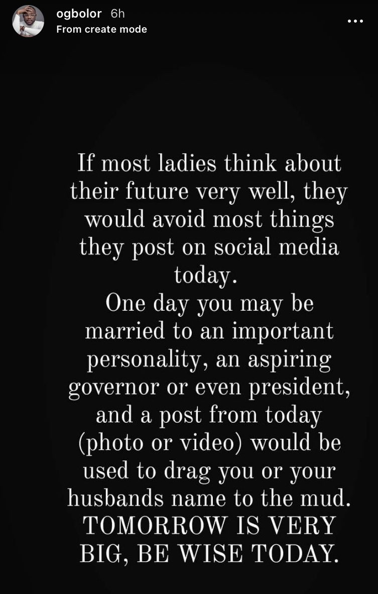 “I can also remember the brotherly advice he gave to me in 2007 when I wanted to buy a G Wagon Mercedes Jeep, He Blatantly said NO , Sis Shebi U Want Men To Begin Run from U, U wan Marry? This kind Car dey drive Men o Lol ,And Trust me I took to his Advise plus he did to me a great favour cos The Same G Wagon gave my Friends headache,ran their bank accounts low( very difficult And Expensive to maintain).”