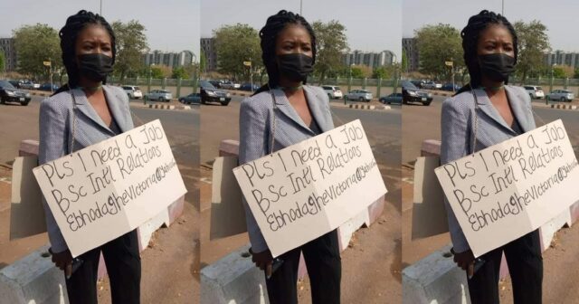 An unemployed young Nigerian lady, Ebhodagbe Victoria has hit the street of Abuja with a placard on her neck in search of a job.
