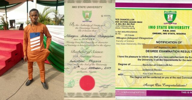 Mbagwu Johnpaul Chiagoziem earned a 4.51 in a 5.0 grading system to emerge the first student ever to graduate with a first class in industrial physics at the educational institution.