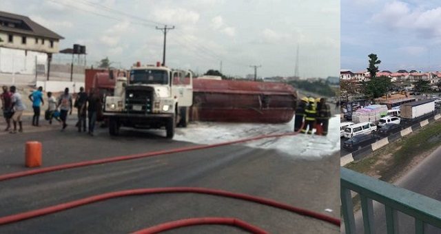 A tanker filled with diesel, today tell at Otedola bridge in Lagos, spilling its content on the road.