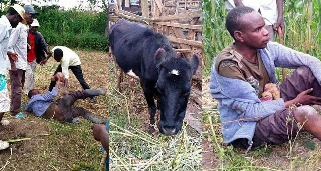 John Mwaura was literally caught pants down with his neighbor’s cow after he stealthy gained his way inside a farm to quench his urge’.