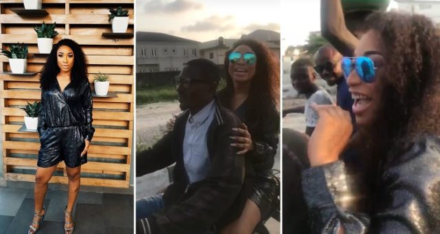 So as to beat the never ending Lagos traffic, the lovely took the fast means of beating a Lagos traffic… Okada as she ditched her car yesterday to get to the cinema for her new movie promo.