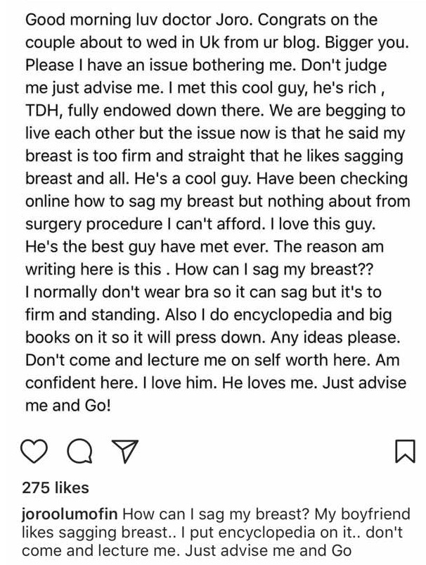 The pains to trim down. Now to return to Lagos and meet all these? I hate him now with all my heart. What should I do? I want to see him. But he’s not taking my calls. He’s stuffs is still here. Help me. Am just doing it. I will go back to size 14. What am I doing wrong? Help! Please am in pains.”
