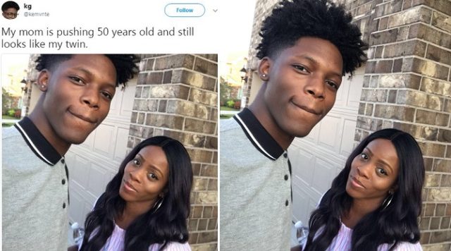 @kemvnte shared a photo of himself and mother on Twitter and after reading the caption, everyone is literally jaw dropped! The lad says his mother is pushing 50 and she looks like his twin.