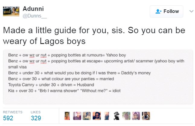 She said she is going to continue with her boyfriend, so me I gats to move on and wait for my own.”