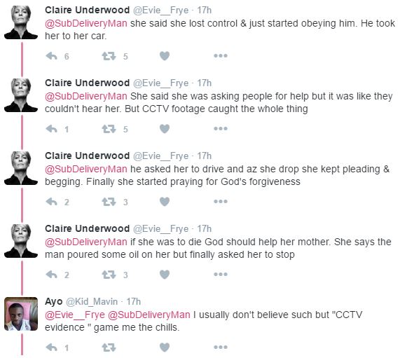 “I was sleeping when I heard the landlord’s voice. The woman was passing by and decided to greet a new tenant here who just rented a shop. After exchange of greetings, she sat and they started chatting. She got here around 4pm. She sat here when the child was jumping on the well.