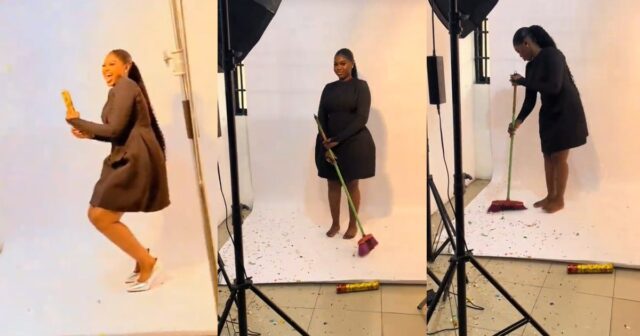 A photographer located in Ibadan, Oyo State, went the extra mile to ensure a clean studio when he instructed his client to sweep after using a party popper during her photoshoot.