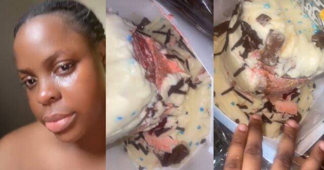 In a TikTok video, the lady @floxyjam23’s eyes were flooded with tears she wept uncontrollably due to the disappointment she experienced. She exclaimed that the cake melted on her way to her destination.