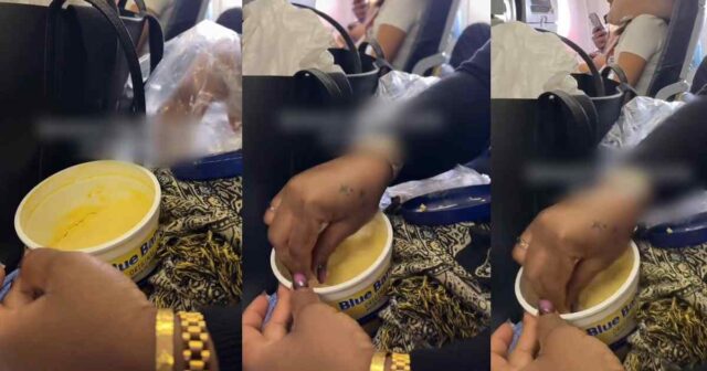 A woman couldn’t hide her surprise after noticing a familiar yet amusing scene during her flight, an African aunty casually enjoying her own meal of bread and butter onboard.