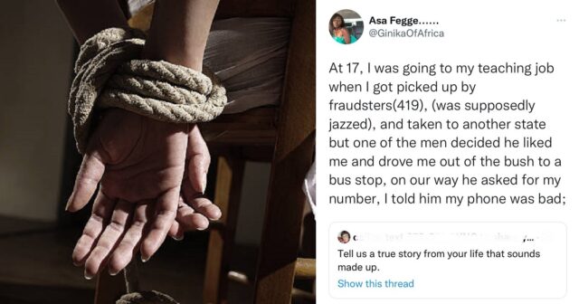 “At 17, I was going to my teaching job when I got picked up by fraudsters(419), (was supposedly jazzed), and taken to another state but one of the men decided he liked me and drove me out of the bush to a bus stop, on our way he asked for my number, I told him my phone was bad;