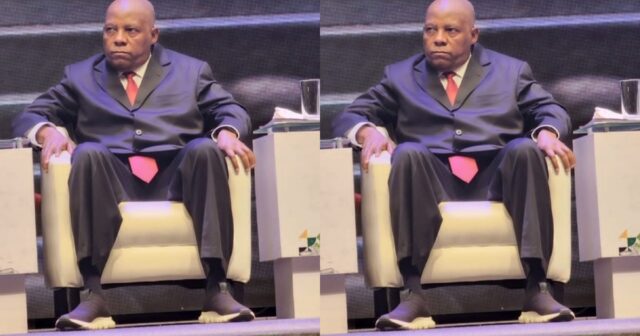 The 55-year-old was dressed in a suit and tie, accompanied by a pair of gym shoes, which has elicited reactions from social media users.