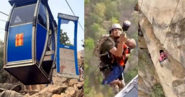 The rocky slopes of the near 2,500ft peak can be seen below the jammed cable cars. Police in Jharkhand state’s Deoghar told international news agencies everyone have now been brought to safety.