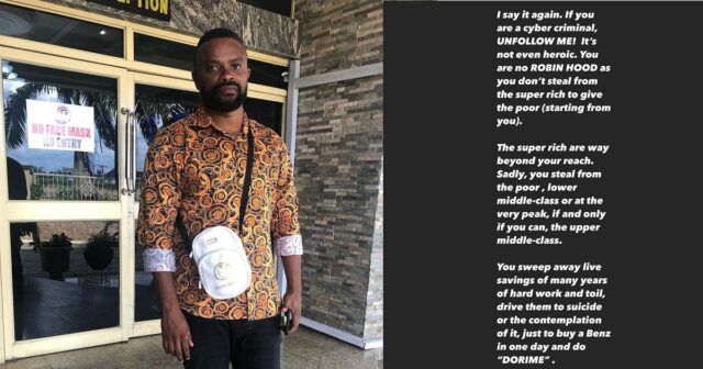 Okon Lagos asked yahoo boys on his list to unfollow him because they are no Robinhoods stealing from the super rich as those people are beyond their reach. He stated that these online fraudsters steal from the poor, lower and upper middle class, and drive them into suicide or contemplation of it.