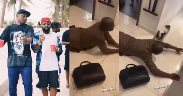 Nigerian singer, Davido’s logistics manager, Israel Afeare, popularly known as Isreal DMW has been captured on camera prostrating for his boss, days after the latter lifted his suspension from the DMW crew.