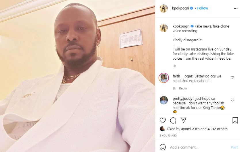 My Dearest Fans, The illegally Recorded and leaked Voice recording of a private conversation by prince kpokpogri making rounds was in the past and has absolutely nothing to do with the recent. I appreciate your Sincere concern, I am doing perfectly ok and in One piece! Be rest assured that every BLACKMAILER will be brought to JUSTICE, it’s the Law and I am at peace knowing the Law will take its course.. Like I always say, “THE ONLY VALID CONVERSATION IS CONGRATULATIONS, because JESUS SAVED ME.